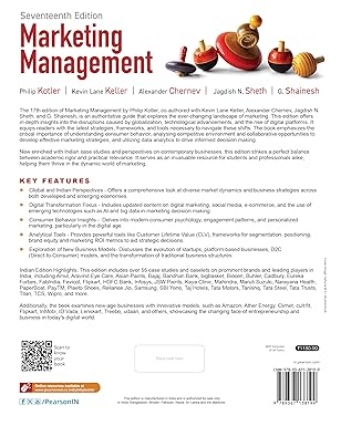 The 17th edition of Marketing Management by Philip Kotler, co-authored with Kevin Lane Keller, Alexander Chernev, Jagdish N. Sheth, and G. Shainesh, is an authoritative guide that explores the ever-changing landscape of marketing. This edition offers in-depth insights into the disruptions caused by globalization, technological advancements, and the rise of digital platforms. It equips readers with the latest strategies, frameworks, and tools necessary to navigate these shifts. The book emphasizes the critical importance of understanding consumer behavior, analysing competitive environment and collaborative opportunities to develop effective marketing strategies, and utilizing data analytics to drive informed decision-making. Now enriched with Indian case studies and perspectives on contemporary businesses, this edition strikes a perfect balance between academic rigor and practical relevance. It serves as an invaluable resource for students and professionals alike, helping them thrive in the dynamic world of marketing.